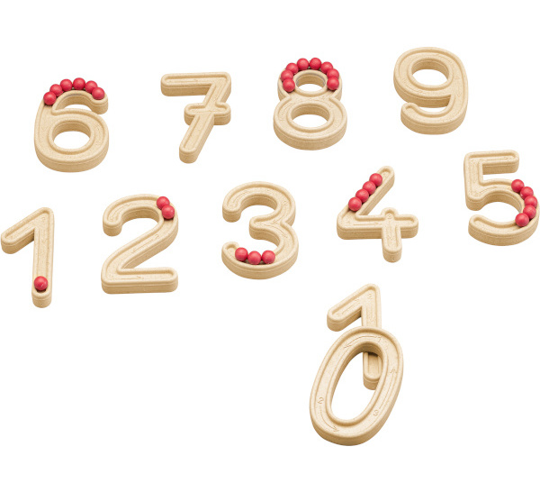 V sadě najdete 11 číslic od 1 do 10 z materiálu RE-Wood® o výšce 7 cm a tloušťce 1 cm. Každá číslice má v sobě vyfrézované drážky; takže ji mohou děti prstem nebo tužkou obtahovat a trénovat tak správný tvar i směr psaní.