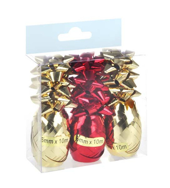 Set balících potřeb obsahuje 3 kusy vázacích stuh (5mm x 10m) a 9 kusů rozet ve zlaté a červené metalické barvě.