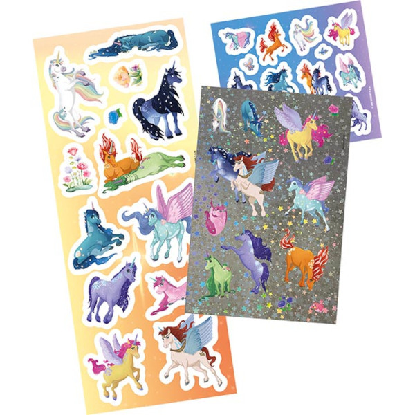 • Set obsahuje list klasických papírových samolepek, list samolepek s fóliovým efektem a list samolepek s barevnými glitry.