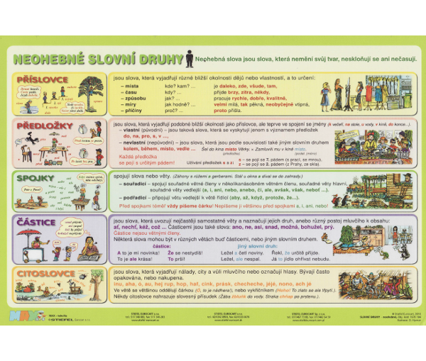 V naučné tabulce jsou uvedeny gramatické významy slov. Názorně uveden příklad použití slovního druhu ve větě. Barevné zvýraznění vždy jednoho slovního druhu pomůže žákům osvojit si poznatek, že ve větě může být slovo i v jiném tvaru než v základním.