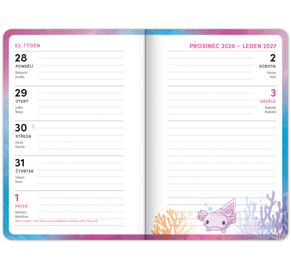 Studentský diář Axolotl (září 2026 – prosinec 2027) 9,8 x 14,5 cm