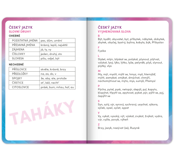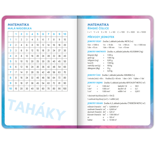 Studentský diář obsahuje přehled na rok 2026 a 2027, české týdenní řádkové kalendárium se jmény a svátky, rozvrh hodin, prostor na poznámky a základní poznatky z matematiky, fyziky, chemie a angličtiny pro studenty.