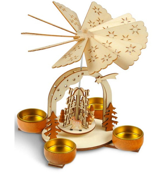 Vánoční dřevěný svícen točící s vyřezanými vánočními motivy.