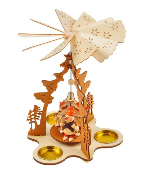 Vánoční dřevěný svícen točící s vyřezanými vánočními motivy.