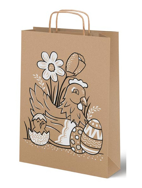 Velikonoční dárková papírová taška s motivem slepičky, kuřátka a velikonočních kraslic.