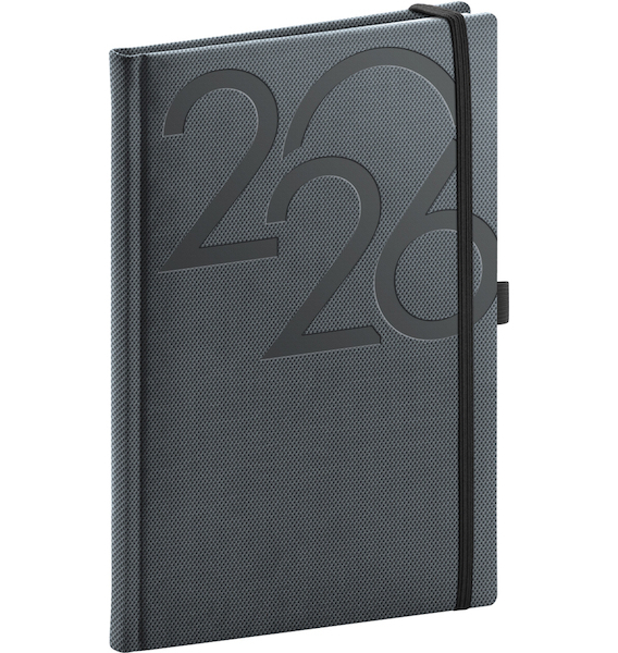 Diář má zakulacené rohy, poutko na tužku a elastickou gumičku.