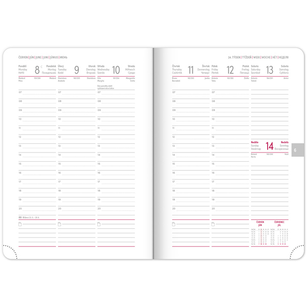 Týdenní rozvrh s česko-slovenským kalendáriem a doplňkovou angličtinou, němčinou, maďarštinou a ruštinou.Šířka: 15 cm