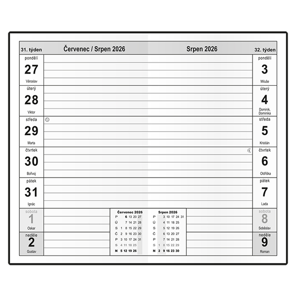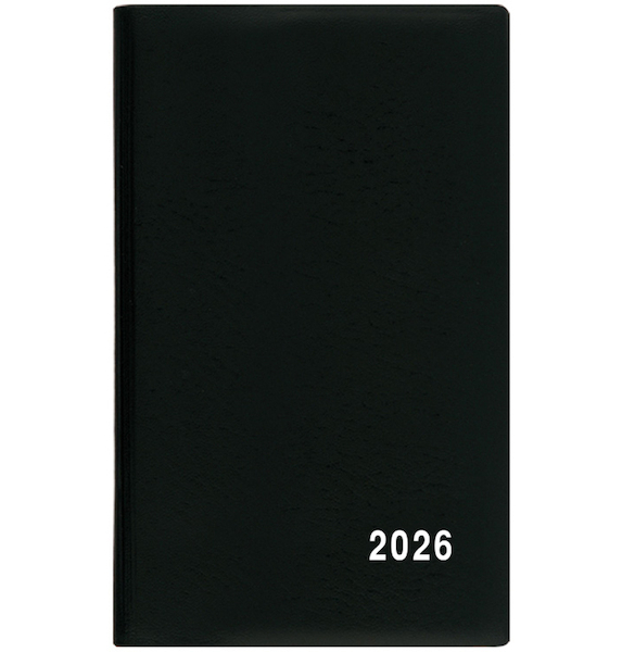 jednoduchý a praktický týdenní diář vyrobený z jemného hladkého materiálu s polomatným povrchem černé barvy • ideální pro každého, kdo si oblíbil měkkou šitou vazbu • kalendárium: měsíční fáze, roční období, letní a zimní čas, tabulkový přehled 2 měsíců • informační stránky: osobní záznamy, důležitá telefonní čísla, čtvrtletní plánovací kalendář aktuálního roku, tabulkový kalendář následujícího roku, jmenný seznam, místo na poznámky, roční plánovací kalendář aktuálního roku • rozměr: 90x150 mm • vhodná technika potisku: sítotisk, ražba přes pásku • BTA1-2-26