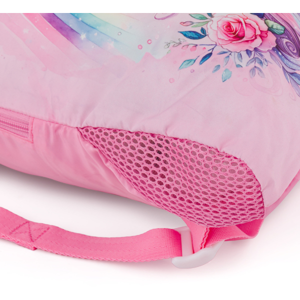 Ve spodní části sáčku je síťované odvětrání. To se hodí hlavně když školačka do vaku hodí zpocený úbor z těláku nebo baletu.