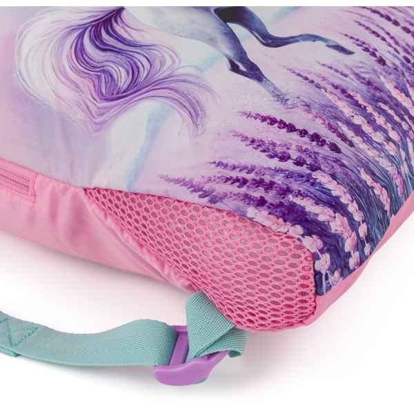 Ve spodní části sáčku je síťované odvětrání. To se hodí hlavně když školačka do vaku hodí zpocený úbor z těláku nebo baletu.
