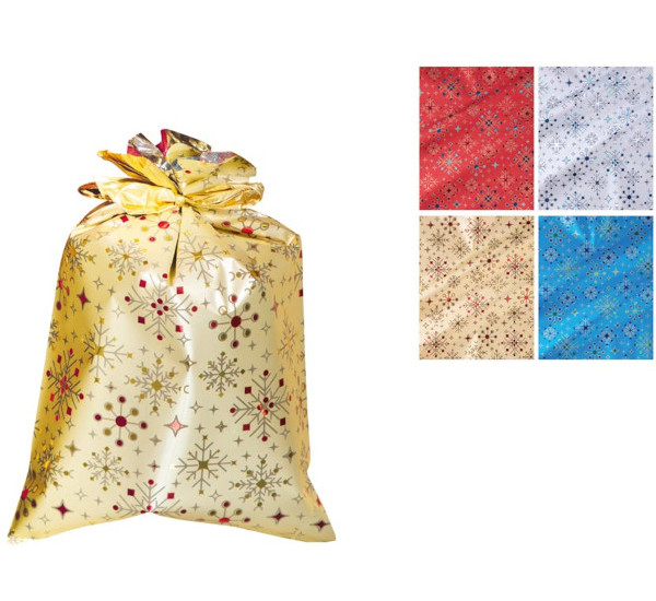 Vánoční průhledný dárkový sáček s motivem vloček v bílé, červené, zlaté nebo stříbrné barvě.