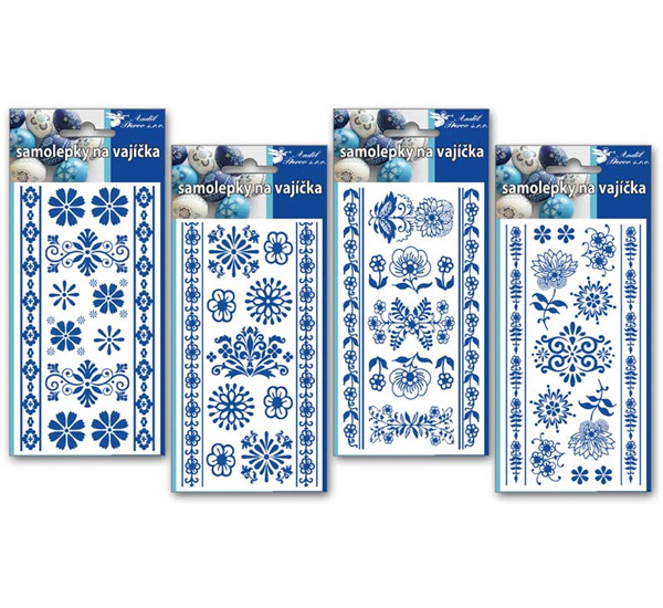 Samolepky na velikonoční vajíčka v modrobílé barvě.