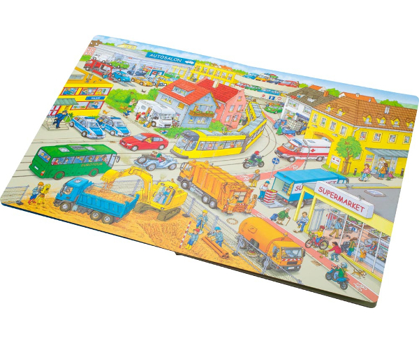 Tato velkoformátová kniha přináší panoramatické obrazové vhledy do prostředí silnic, staveb, ale i jiných. Bohatě propracované názorné ilustrace jsou pro děti velkým lákadlem, bezednou studnicí inspirace a zároveň obrovskou výzvou – množství detailů je přitahuje, podněcuje jejich představivost a fantazii. Malý vypravěč v interakci s dospělým nejen popisuje, co vidí na obrázcích, ale také v nich hledá, a hlavně kreativně a hravě rozplétá a opět spojuje nekonečné nitky možných příběhů. Knihy tak velmi účinně napomáhají budování slovní zásoby, komunikačních schopností i logického myšlení. Dítě tříbí svůj postřeh, zrakovou a sluchovou paměť, a činí tak první krůčky na své cestě k rozvoji aktivního čtenářství.