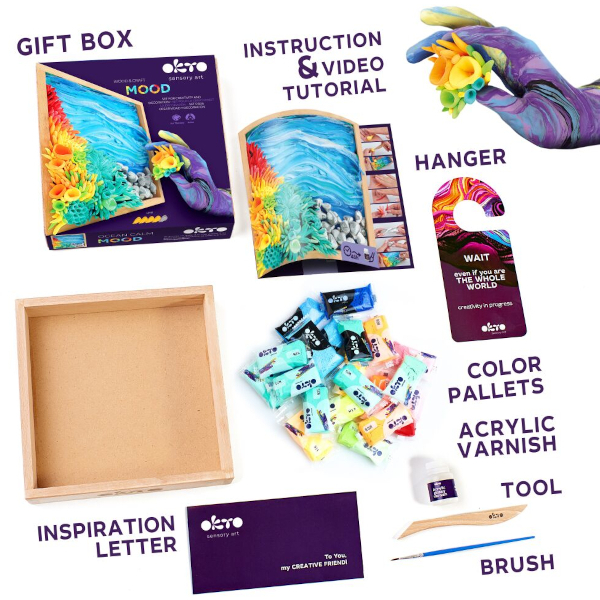 Obtížnost 4/5. Obsah balení - rám, obrázkový návod, dřevěné modelovací nástroje, sada modelovací hmoty, akrylový lak 20ml, štětec.