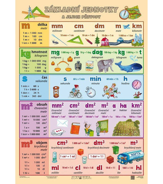 Obsah přední strany tvoří jednotky délky, hmotnosti, času, obsahu a objemu, s převody jednotek a s názornými ilustracemi.